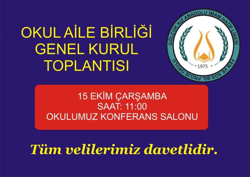 2025-2026 Eğitim Öğretim dönemi "Okul Aile Birliği Genel Kurul Toplantısı", 15 Ekim Çarşamba günü okulumuz konferans salonunda saat 11:00'de yapılacaktır. Tüm velilerimiz davetlidir.